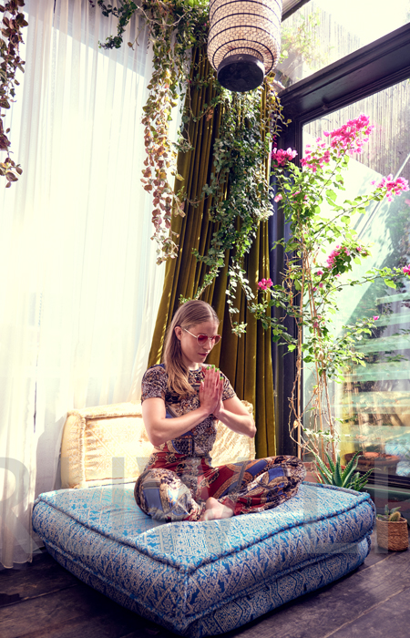 ‘Ik heb het vaak “te druk” om te mediteren. De asana’s zelf zijn dan mijn meditatie. Op het toneel staan kun je ook een vorm van meditatie noemen. Ik sta de ballen uit mijn broek te spelen, volledig fysiek aanwezig en mega-alert. Eén keer per jaar ga ik naar een ashram in India om te mediteren. Juist omdat ik zo grenzeloos ben, gedij ik goed bij de structuur en discipline van een ashram. De eerste week loop ik nog heftig te stuiterballen, maar daarna kan ik het loslaten. Dan kan ik wortelen en diep in de meditatie komen.’