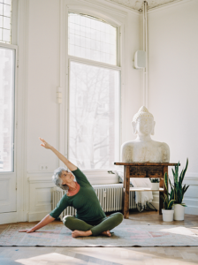 Annette: ‘Ik vind deze houding heerlijk om ’s ochtends mee te beginnen, nadat ik mezelf eerst heb uitgerekt. Ze opent je hele bovenlichaam.’