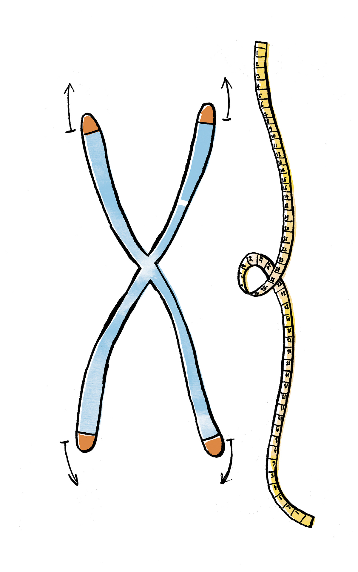 Aan de uiteinden van onze chromosomen zitten een soort slijtzones – telomeren – die bij elke celdeling een stukje korter worden. Deze telomeren worden beschouwd als een biologische klok: hoe korter de telomeren, hoe ouder de cel. Korte telomeren gaan samen met allerlei verouderingsverschijnselen en als ze voorbij een bepaald punt afgesleten zijn, legt de cel het loodje. Ziedaar een belangrijke reden dat onze cellen zich niet oneindig kunnen blijven delen en wij dus niet over het eeuwige leven beschikken. Na afloop van het experiment waren de telomeren van de proefpersonen echter gemiddeld weer iets langer geworden; een stofje dat telomeren beschermt en kan laten groeien – telomerase – was aanzienlijk toegenomen.