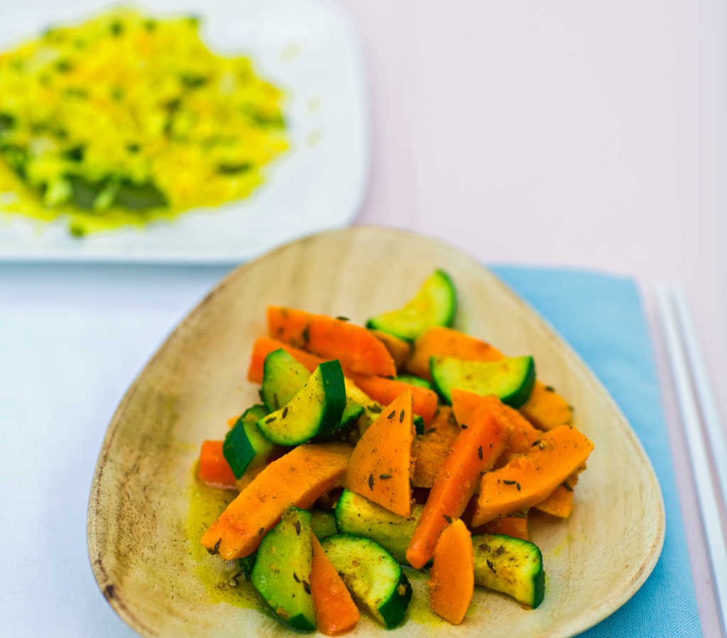 Was de groenten en snijd ze in stukken. Voor een mooi visueel effect snijd je elke groente in een andere vorm (de wortel in schijfjes, courgette in dikke halve schijven, pompoen in blokjes). Verwarm een koekenpan en voeg de ghee of de olie toe. Doe dan het komijn-, mosterd- en ajowanzaad erbij. Voeg de asafoetida toe. Wanneer de mosterdzaadjes springen, voeg je de masala en de kurkuma toe. Roer even en voeg dan de groenten toe. Roer zodat de specerijen goed over de groenten worden verdeeld. Zet het vuur laag en doe een deksel op de pan. Roer even na 5 minuten. Kook de groenten in hun eigen vocht gedurende 15 minuten of tot ze zacht zijn geworden. Serveer met kichadi.