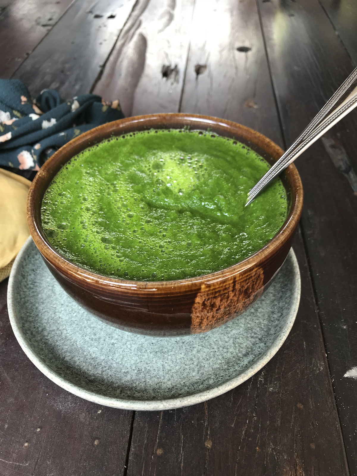 Als lunch de ‘groene soep’, een warm gemaakte groenteshake met onder meer gotu kola en spirulina. Rond vier uur de snack: weer een andere groenteshake en een kokosnoot. En ’s avonds misosoep, protein juice en… kokosnoot.Sommige mensen zie ik een beetje zuchten bij dit menu en meewarig staren naar dit uitbundige driemaal-daagse buffet. Maar ik vind zelfs de shakes heel lekker! Niet het tarwegras-shot, dat is altijd even doorbijten en snel wegspoelen met maakt niet uit wat.