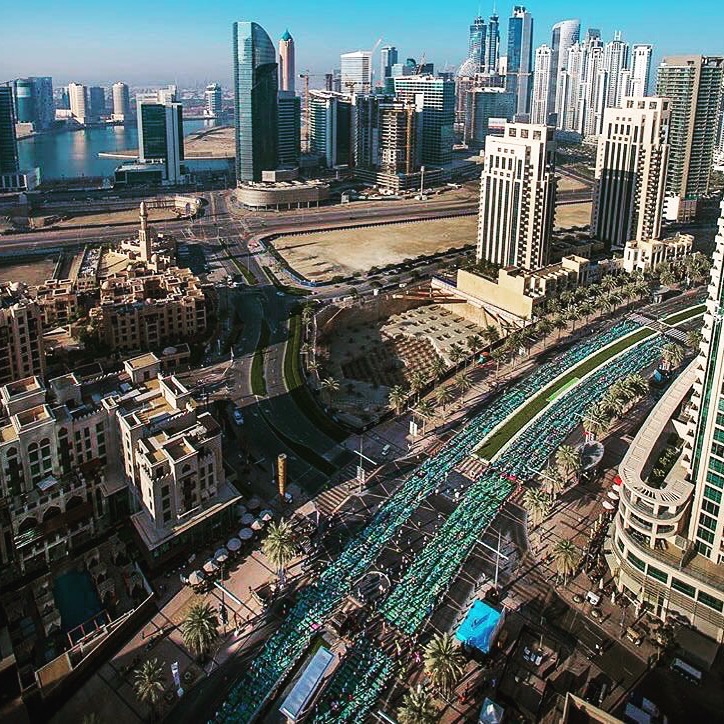 ‘Ik had geen idee waarin ik terecht was gekomen, het leek net Las Vegas in de woestijn,’ vertelt Sanne. Het geheel werd nog surrealistischer toen maar liefst 11.000 yogamatten werden uitgerold op de afgezette highway van het centrum van Dubai. Het moge duidelijk zijn: in Dubai houden ze niet van half werk.