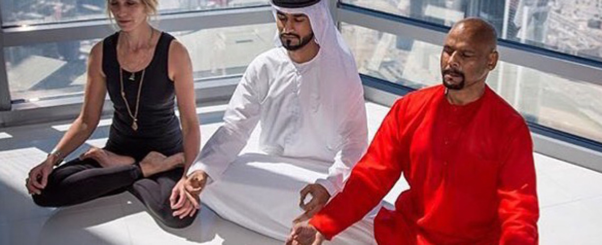 Deze foto illustreert de belangrijkste boodschap van het evenement: yoga is voor iedereen, overal. Op de top van het hoogste gebouw van Dubai, The Burj Khalifa, zie je Sanne naast een moslim local uit Dubai en daarnaast de guru Suneel Singh, die behoort tot de beste 5 yoga-instructeur van India.