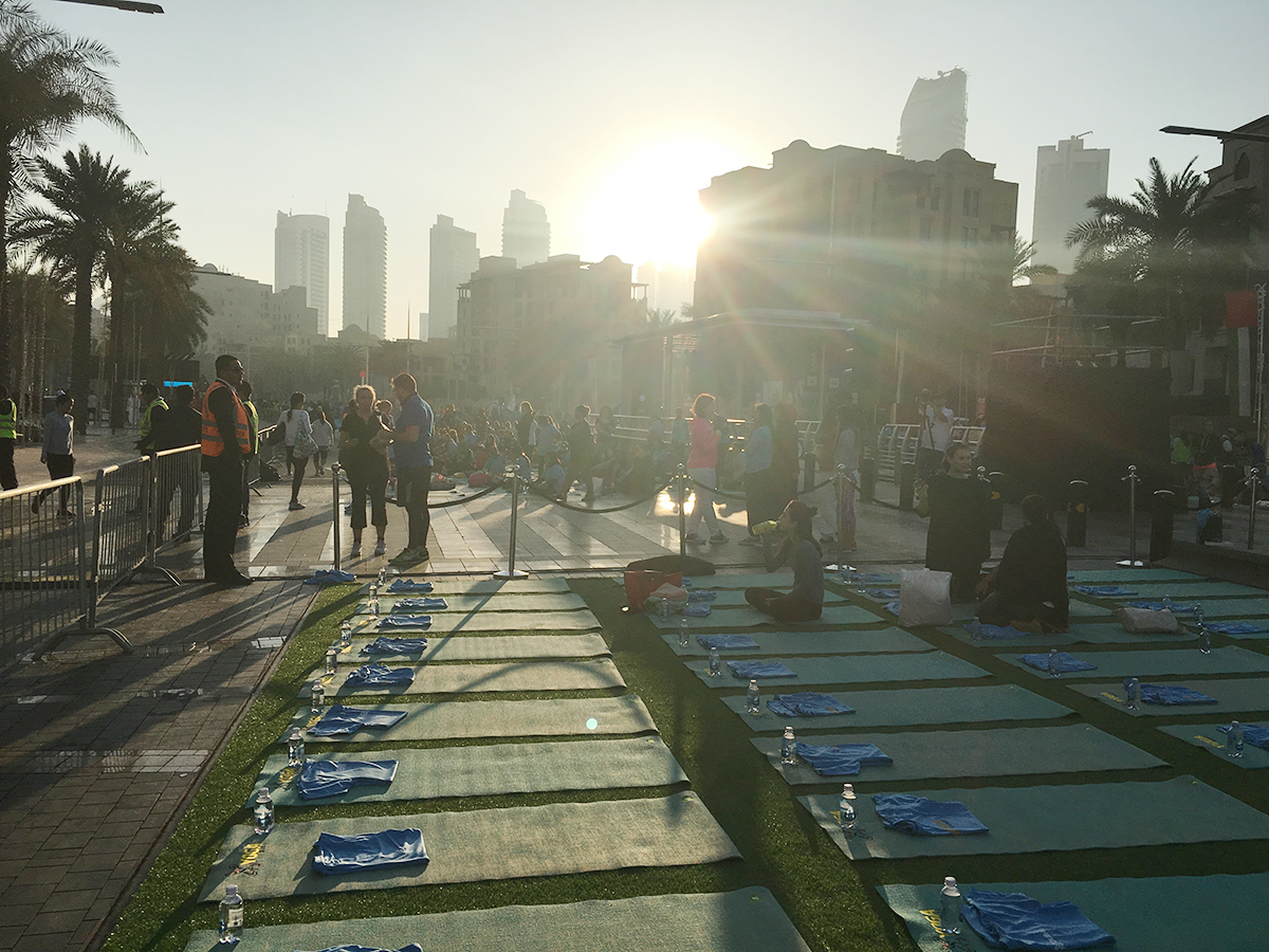 ‘Ik had geen idee waarin ik terecht was gekomen, het leek net Las Vegas in de woestijn,’ vertelt Sanne. Het geheel werd nog surrealistischer toen maar liefst 11.000 yogamatten werden uitgerold op de afgezette highway van het centrum van Dubai. Het moge duidelijk zijn: in Dubai houden ze niet van half werk.