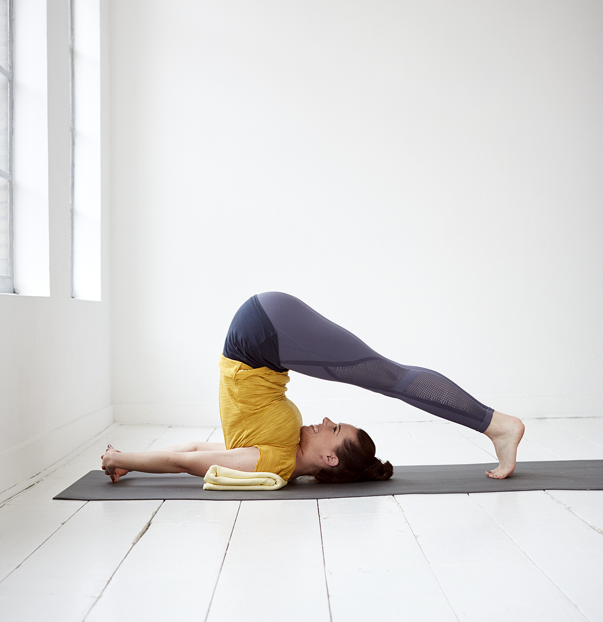Een lastige Ploeg kan verschillende oorzaken hebben. Zijn het je stijve hamstrings die belemmeren dat je voeten op de vloer komen, buig dan je knieën of zet je voeten op een stoel achter je hoofd. Is je nek een beetje stijf, dan kan een dekentje onder je bovenrug helpen. Maar bij een stijve nek, schouders of bovenrug kun je beter eerst met alternatieven aan de slag.