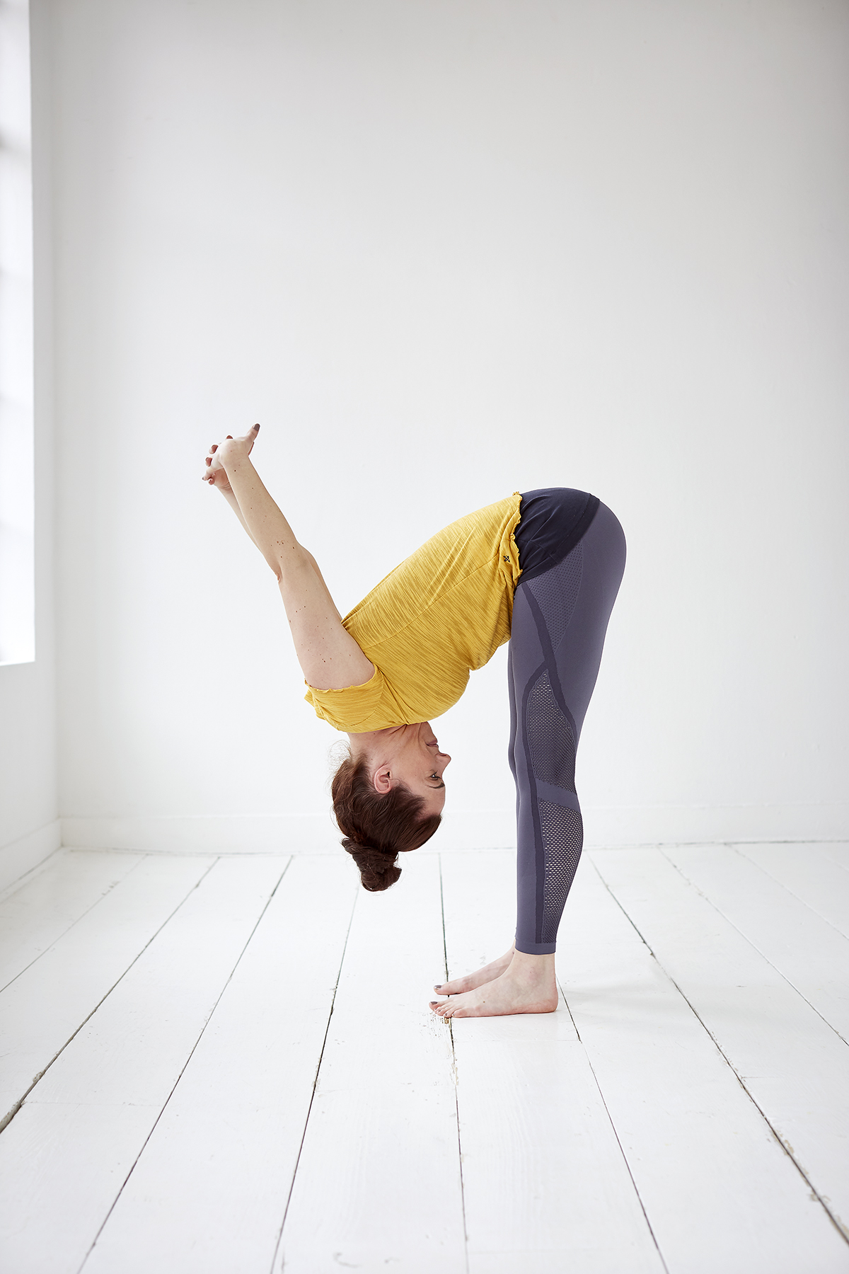 Check eerst of je je kin op je borst kunt leggen. Lukt dit niet, dan zijn je nekspieren waarschijnlijk nog te kort om comfortabel in de Ploeg te komen. Voor een veilige Ploeg moet de nek namelijk zeker negentig graden kunnen buigen. Kan de nek niet zo ver naar voren bewegen, dan wordt je rug bol en blijven je voeten boven de vloer zweven. Al het gewicht komt dan op je nek en dat wil je vermijden. Ook je schouders moeten voldoende naar buiten kunnen draaien. Alleen dan kun je je armen goed onder je rug brengen. Je borstkas kan dan makkelijker omhoogkomen.