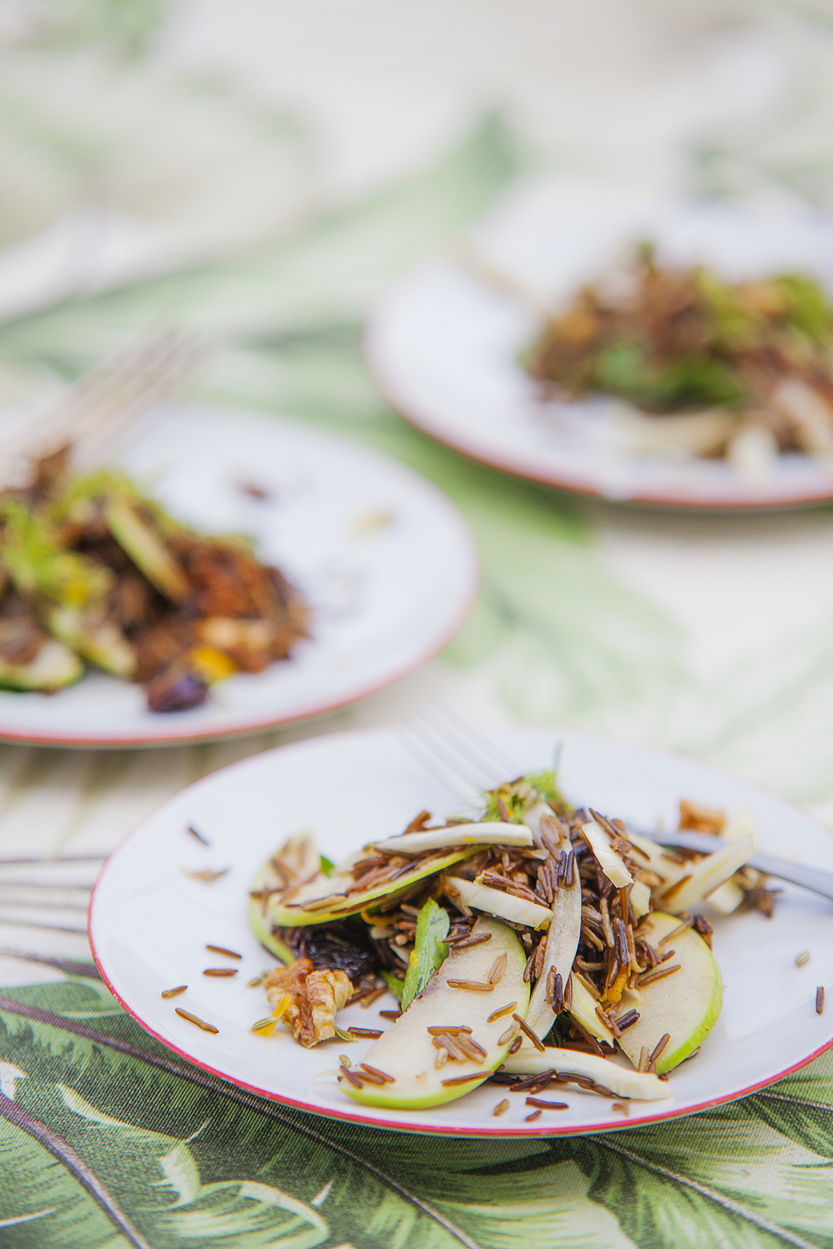 Laat de rijst 30 minuten weken in koud water. Spoel schoon en kook dan gedurende 30 minuten tot gaar. Laat afkoelen. Terwijl de rijst kookt: week de krenten in het sinaasappelsap. Verwijder het klokhuis van de appel en snijd in blokjes. Snijd de venkel in blokjes of in flinterdunne schijfjes. Rooster de walnoten in een droge koekenpan tot goudbruin. Giet de krenten af en doe ze samen met de gekookte rijst, venkel, appel en walnoten in een kom. Meng alle ingrediënten voor de dressing en besprenkel het rijstgerecht ermee. Serveer direct.