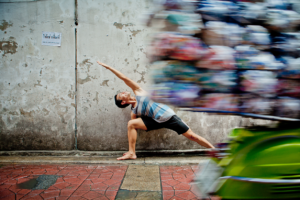 Yogadocent Grisana Punpeng uit Bangkok: ‘De fotograaf en ik kozen voor een shoot op het allerdrukste punt van Chinatown. Eerst spannend en daarna bevrijdend om gewoon midden op straat yoga te doen!’