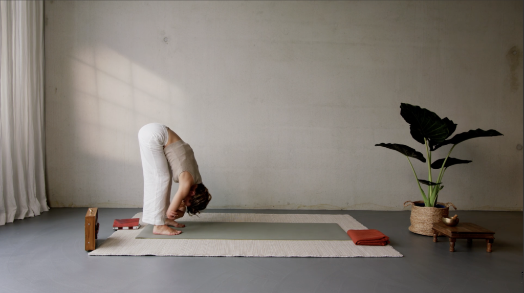 Uttanasana is een aardende houding. Met de voeten stevig in de grond verbind je jezelf met de aarde onder je. Tegelijkertijd zorgt de buiging over je benen, en de zwaarte van je bovenlichaam, dat je letterlijk kunt loslaten. Beeld je maar in dat alles van je rug, de aarde inglijdt.