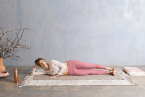 De laatste oefening doe je lekker relaxt liggend op je zij. Je hoofd rust in je hand.