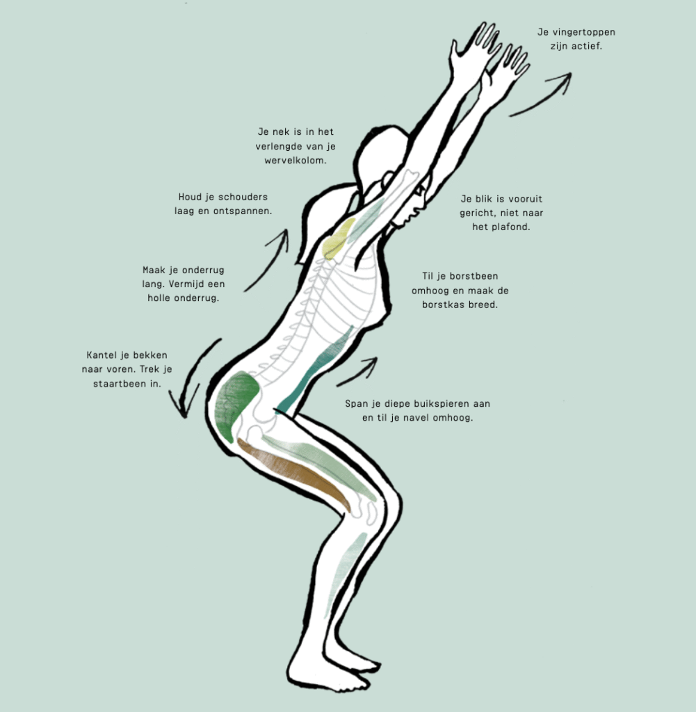 ‘Stel je voor dat je op een denkbeeldige stoel gaat zitten,’ is een instructie die je geregeld hoort bij het aannemen van de Stoelhouding. Begrijpelijk, maar probeer eens het tegenovergestelde te doen. Zet je voeten stevig op de grond en strek jezelf dan op, van de aarde naar de hemel. In plaats van een neerwaartse, een opwaartse beweging dus. Hoe voelt dat? Gebruik de zwaartekracht om de juiste uitlijning in de houding te vinden. Het gewicht van je bovenlichaam fungeert daarbij als kompas: navigeer naar een punt waarop je zo min mogelijk inspanning in je spieren ervaart en juist tot een gevoel van lichtheid komt. Draag je gewicht niet op je tenen of hakken, maar met de hele lengte van je voet. Eenmaal in de juiste positie til je – net als een heilige – je armen omhoog de lucht in. Je straalt niets dan positieve energie uit naar alles en iedereen om je heen.