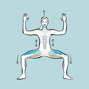 Zet jezelf stevig op de aarde neer in deze houding met de voeten zo’n anderhalve schouderbreedte uit elkaar, benen gebogen en je voeten iets naar buiten gedraaid. Dat stimuleert de kracht in je onderlichaam omdat je dij- en buikspieren aan het werk worden gezet. Tegelijkertijd opent je hart met je armen wijd in een hoek van negentig graden. Zo belichaamt de pose de essentie van het vrouw zijn: zacht en krachtig tegelijk. Geef de houding nu meer diepte. Breng je aandacht naar je voetzolen en voel hoe met elke ademhaling de energie vanuit de aarde via je voeten je lichaam in stroomt. Hoe meer geopend je heupen zijn, des te toegankelijker de pose zal aanvoelen. Ontspan je kaken – die vormen een energetisch verbond met de heupen – voor innerlijke zachtheid in de houding.