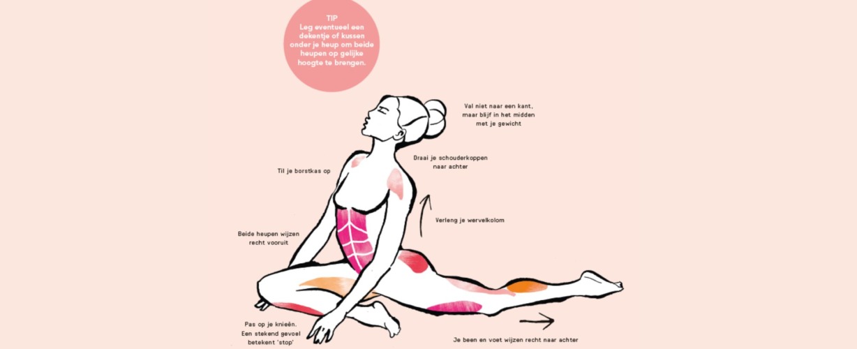 Het helpt om vanuit de Neerwaartse Hond te starten. Plaats één knie op de mat tussen je handen. Buig je voorste been, en houd je onderbeen dicht bij je bovenbeen. Blijf laag bij de grond terwijl je je gewicht naar het midden beweegt. Met een rustige ademhaling laat je de spanning in je heupen los. Pas als hier meer ruimte ontstaat, breng je je onderbeen meer naar het midden en duw je jezelf vanaf je handen omhoog. Ben je meer geoefend? Doe de houding dan ook eens tijdens een Vinyasa Flow practice. De warmte in je lijf helpt je om de diepe stretch te maken.