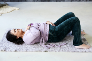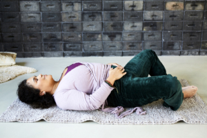 • Leg je handen op je buik en adem naar je handen. Laat je lichaam dragen door de grond. Blijf 3-5 minuten in de houding.