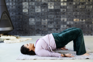 • Breng op een inademing je onderlichaam omhoog. Je armen liggen langs je lichaam op de grond. Strengel eventueel je vingers onder je rug in elkaar. Hou je knieën parallel aan elkaar.