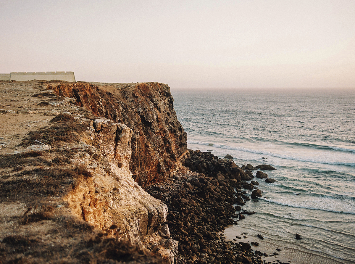 Aan het ruige landschap vol kronkelende wegen lijkt geen einde te komen als we ineens in de verte tussen de duinen een prachtige driehoek blauw ontdekken. De zee. Het kan niet lang meer rijden zijn, fotograaf Hanke leest de routebeschrijving voor: ‘In een bocht naar rechts, neem de onverharde weg links en daar is de poort.’ Bij de quinta, de boerderij, luieren mensen aan het zwembad. De wind rukt zo hard aan de palmbomen dat ik me afvraag of we echt op het uiterste puntje van Europa zijn aanbeland – ik had me de zuidkust van Portugal heter voorgesteld. Maar terwijl een houten Boeddha omwaait, voel ik de zon branden op mijn onderarmen en weet ik dat we een stuk dichter bij de evenaar zijn dan een paar uur geleden, toen we instapten op Schiphol.