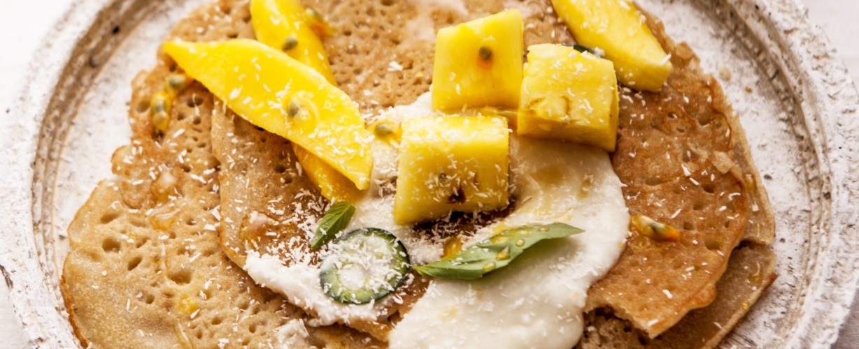 Rijst-kokos-pannenkoekjes met exotisch fruit