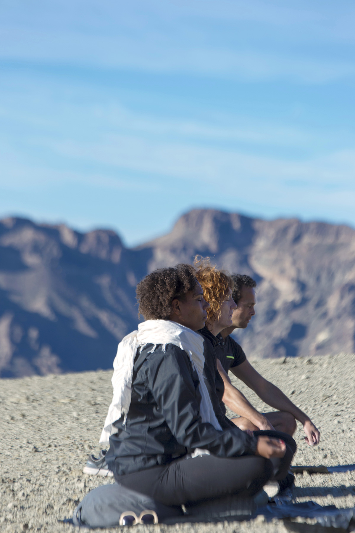 Op een van de laatste dagen neemt Afke mijn laatste beetje stress weg met een tripje naar de imposante vulkaan El Teide in het midden van Tenerife. De hete rode lava die hier ooit vloeide, is nu versteend in een oneindig grijs plateau. Op dat plateau nemen we plaats. We zitten in de ijle lucht in een wijde kring op onze yogikussentjes. Na een meditatie van mededocent Micha zet Afke upbeatmuziek op van Free Tibet, en vraagt ons op te staan, al springend snel in en uit te ademen en tegelijkertijd met onze armen op en neer door de lucht te zwaaien. Het voelt wat ongemakkelijk, maar nadat het liedje is afgelopen, mogen we weer op ons kussentje op het grijze steen gaan zitten.