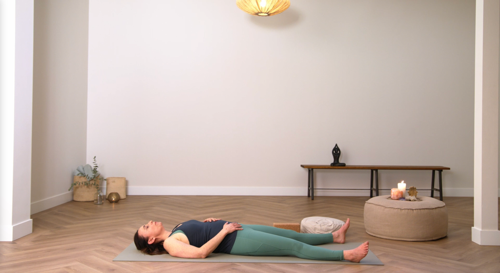 Ga op je rug liggen met ontspannen benen. * Leg je rechterhand op je navel en je linkerhand op je rechterhand. * Breng je handen met zachte druk iets naar boven, naar links, naar beneden en naar rechts. * Maak 3 keer deze zachte cirkelende beweging. * Laat je handen tot stilstand komen en leg je armen naast je neer in een neutrale Savasana. * Blijf 10 ademhalingen liggen om het effect van deze practice te voelen.