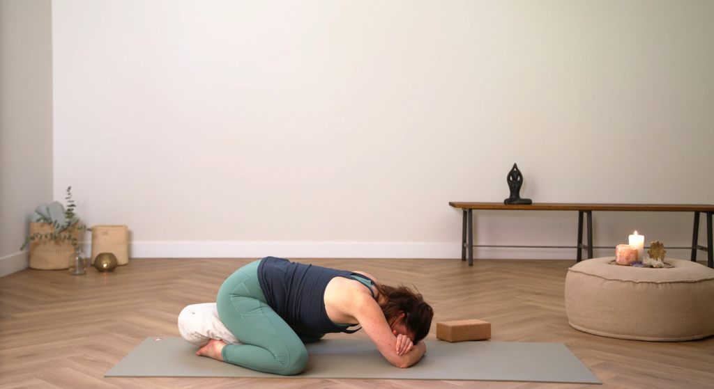 Ga op handen en knieën zitten en zak met je billen richting je hielen. * Houd je grote tenen bij elkaar en spreid je knieën wijder. * Plaats een kussentje op je voeten en laat je billen op het kussentje rusten. Je buik heeft nu meer ruimte. * Plaats je onderarmen vóór je op de mat, pak met je handen je ellebogen vast en laat je hoofd op je armen rusten. Je kunt hier ook een blok gebruiken. * Laat je buik helemaal ontspannen. * Adem 5 tot 10 keer. * Kom rustig uit de houding.