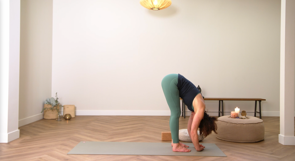 Buig vanuit de Berghouding (Tadasana) rustig met je bovenlichaam naar voren en beneden. * Laat je buik zacht zijn, buig je knieën licht, laat je bovenlichaam bungelen. Laat de zwaartekracht helpen om je buik te ontspannen. * Blijf hier 3 tot 5 ademhalingen, of zo lang als je wilt. * Buig je knieën wat meer en rol je rug rustig wervel voor wervel omhoog naar een staande houding.