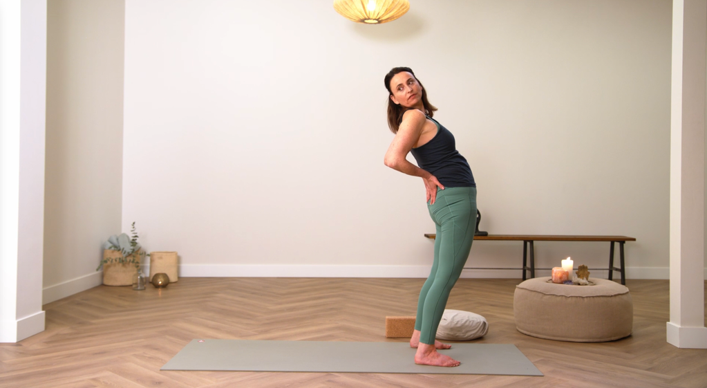 Begin zittend met beide benen gestrekt vóór je. * Buig het rechterbeen en zet je voet voor je rechterbil, verplaats je gewicht eventueel nog wat naar voren zodat je recht op je zitbotten zit. * Gebruik een kussentje of opgevouwen deken als extra hulp om rechtop te zitten. * Houd je linkerbeen gestrekt en actief. * Adem in, verleng je rug, omarm met je linkerarm je rechterbeen en kom in een zachte twist naar rechts. * Zet je rechterarm achter je en kijk schuin naar achteren. * Laat de draaiende beweging uit je rug komen. Langzaam ‘wring’ je jezelf uit. * Houd je buik en armen ontspannen. * Blijf hier 3 à 5 ademhalingen, of zo lang als je wilt. * Draai rustig terug en wissel van kant.