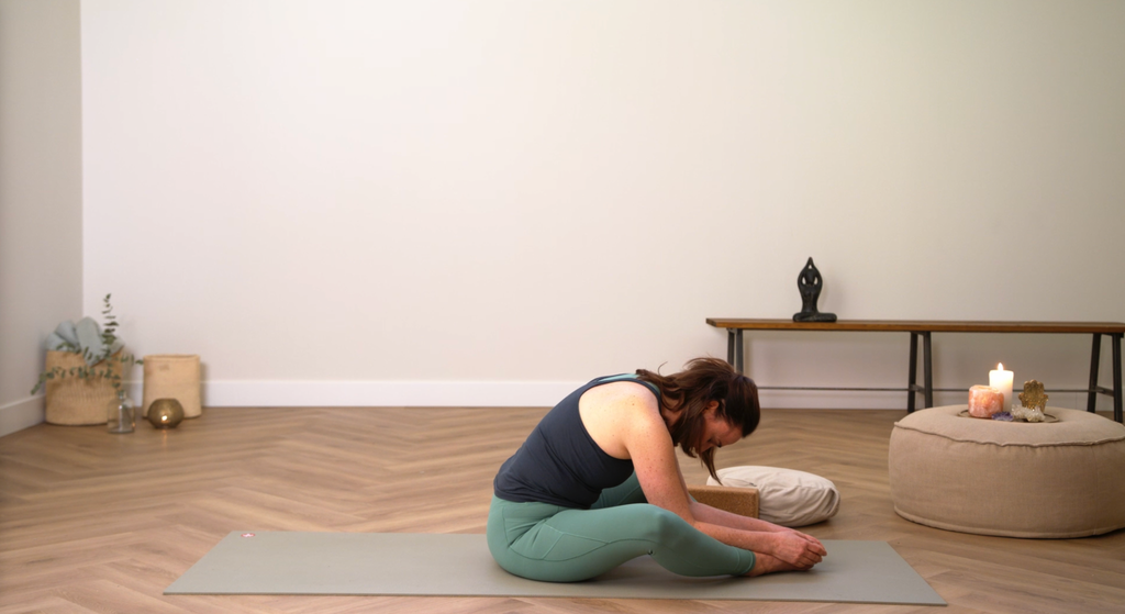 Door op een kussentje te zitten is er meer ruimte voor je buik, probeer je buik volledig los te laten en door de zwaartekracht te laten ‘hangen’. De houding heeft een kalmerende werking en kan helpen bij (menstruatie)krampen.
