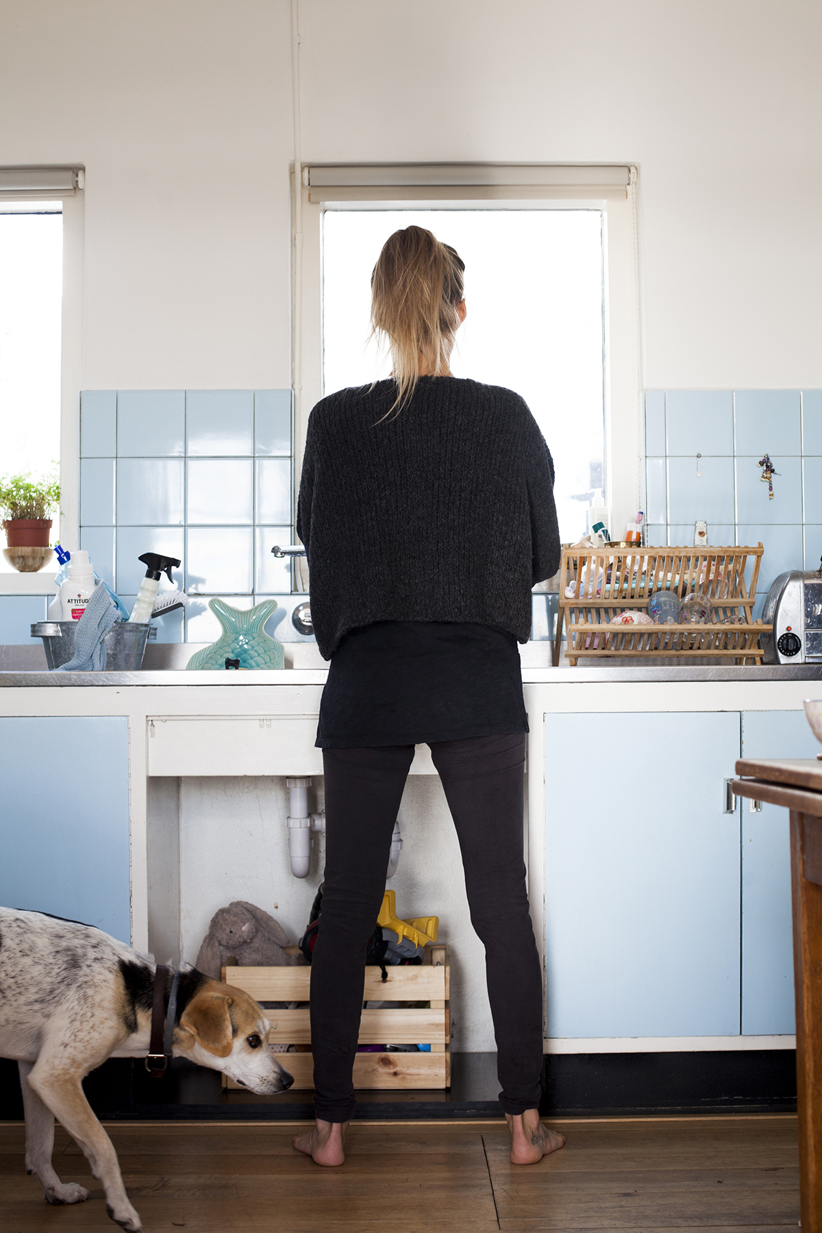 ‘Ik heb wel een vaatwasmachine, maar ouderwets de afwas doen vind ik heel rustgevend. Ik zorg ervoor dat ik recht sta, dat ik mijn voeten stevig op de grond voel staan. Mijn handen in het warme sop, een sponsje om de borden schoon te maken. Als het lukt om aandachtig af te wassen is dat een heel goede grondingsoefening.’