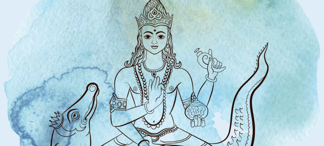 Varuna is een van de oudste Vedische goden en nog altijd een krachtige aanwezigheid in de yogafilosofie. Hij heerst over de hemel, de oceanen en rivieren, hij is de allesomvattende kracht die aarde, water en lucht met elkaar verbindt. Zijn naam betekent ‘omringen’: Varuna is degene die het leven omsluit en beschermt.