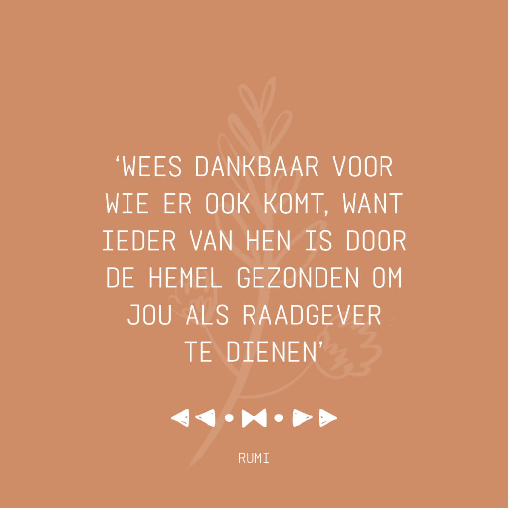 Wees dankbaar voor wie er ook komt, want ieder van hen is door de hemel gezonden om jou als raadgever te dienen Leestijd: 1 minuut Jasmijn Demmer Over auteur Jasmijn Demmer Delen via: 19 oktober 2022