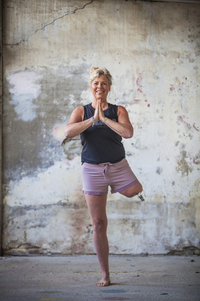 Elke dag doe ik yoga, maar er zijn niet zo veel houdingen die ik prettig vind. Meestal doe ik de Zittende of de Liggende Vlinder, om te ontspannen. Op goeie dagen doe ik de Zonnegroet – dan moet ik mijn prothese aan. Maar het liefste laat ik die af. Gek genoeg voel ik me dan meer heel. Een balanshouding als de Boom lukt sinds een poosje ook – zonder prothese. Ik visualiseer dan heel sterk mijn geamputeerde been en voet, en voel de druk daarvan op mijn andere bovenbeen. Dan sta ik steviger dan mét prothese.’