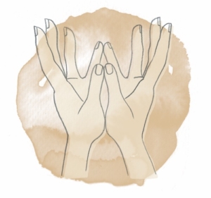 Sluit je ogen. Zet je handpalmen tegen elkaar en breng ze voor je hart; dit heet Anjali mudra. Neem even de tijd. Voel je duimen vlak bij je hart. Adem rustig en diep naar je buik. Adem in en beweeg je handen omhoog. Je handpalmen blijven tegen elkaar, je onderarmen raken elkaar nu ook. Open aan het eind van de inademing je handen als een lotus: je duimen en pinken blijven verbonden, je spreidt je andere vingers en opent je handen. Adem rustig uit en maak de beweging omgekeerd, tot je je duimen weer bij je hart voelt. Herhaal de oefening 10 keer. Voel na met gesloten ogen.