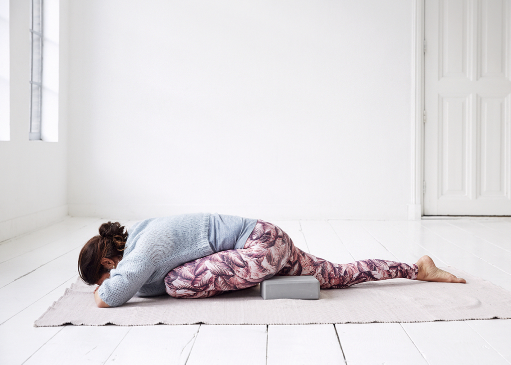 Leg een bolster of blok onder de heup van je voorste been. Die tilt je heupen een stukje omhoog waardoor de druk op de knie minder wordt en je het bekken niet overbelast. Vanaf hier kun je verder werken aan het openen van je heupen. Uiteindelijk breng je de heupen recht naar voren.