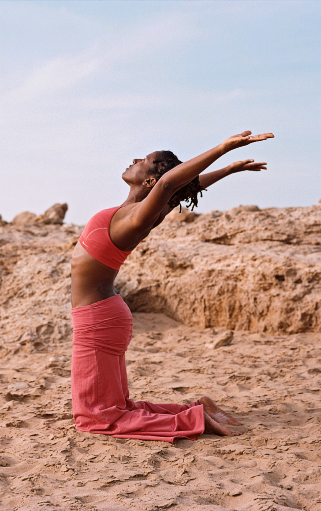 • Spreid vervolgens beide armen schuin naar achteren omhoog, terwijl je de schouderbladen naar elkaar toe brengt. Je bent nu in de Halve Kameel.