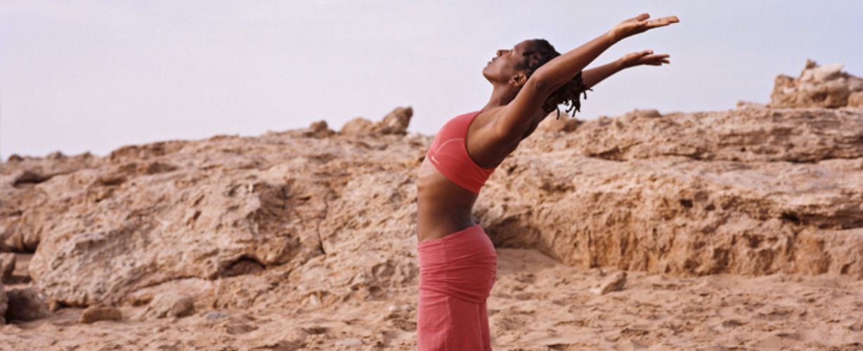 • Spreid vervolgens beide armen schuin naar achteren omhoog, terwijl je de schouderbladen naar elkaar toe brengt. Je bent nu in de Halve Kameel.