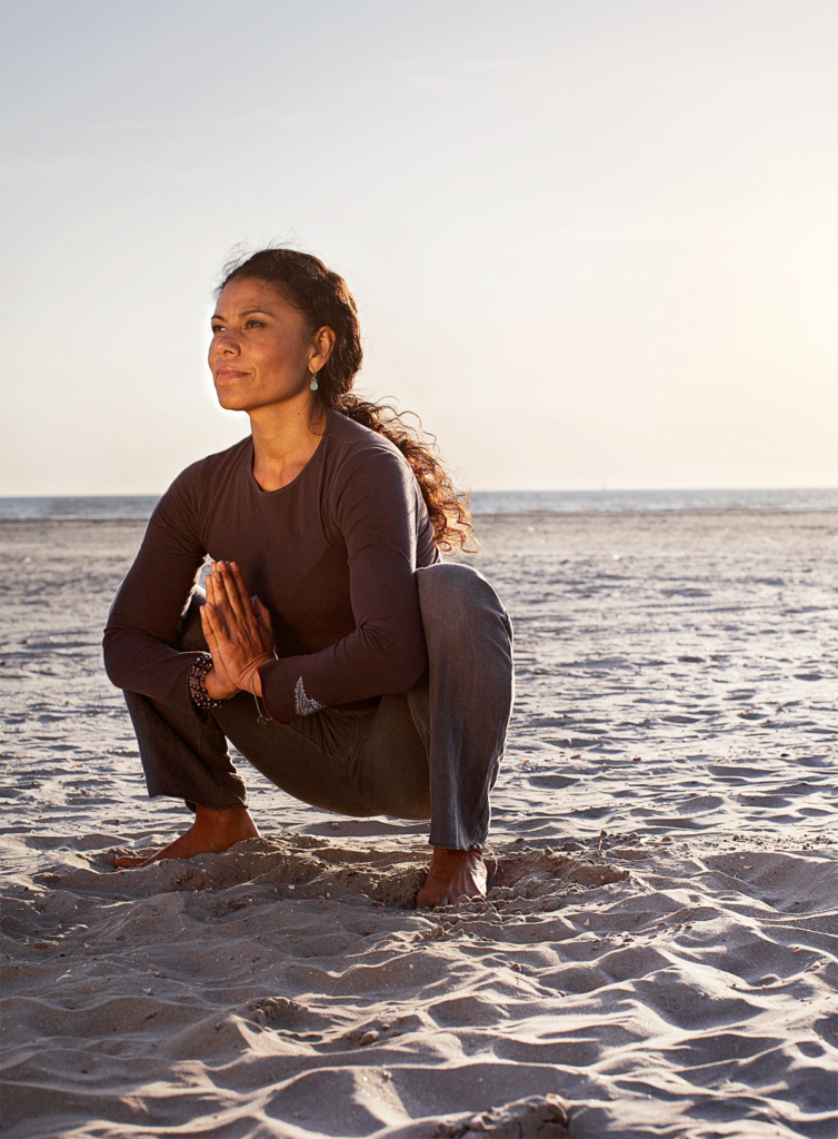 • Kom op een uitademing in de hurkhouding zitten.