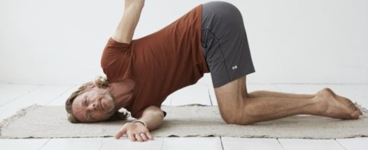 • Breng je rechterschouder en je hoofd naar de grond, je rechterarm is gestrekt en drukt in de mat voor balans.