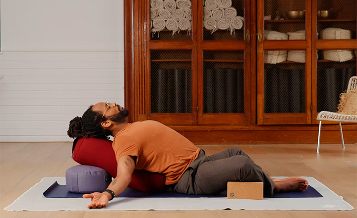 Voor deze les is het fijn een bolster, twee blokken en een meditatiekussen klaar te leggen. En eventueel een dekentje voor de eindontspanning.